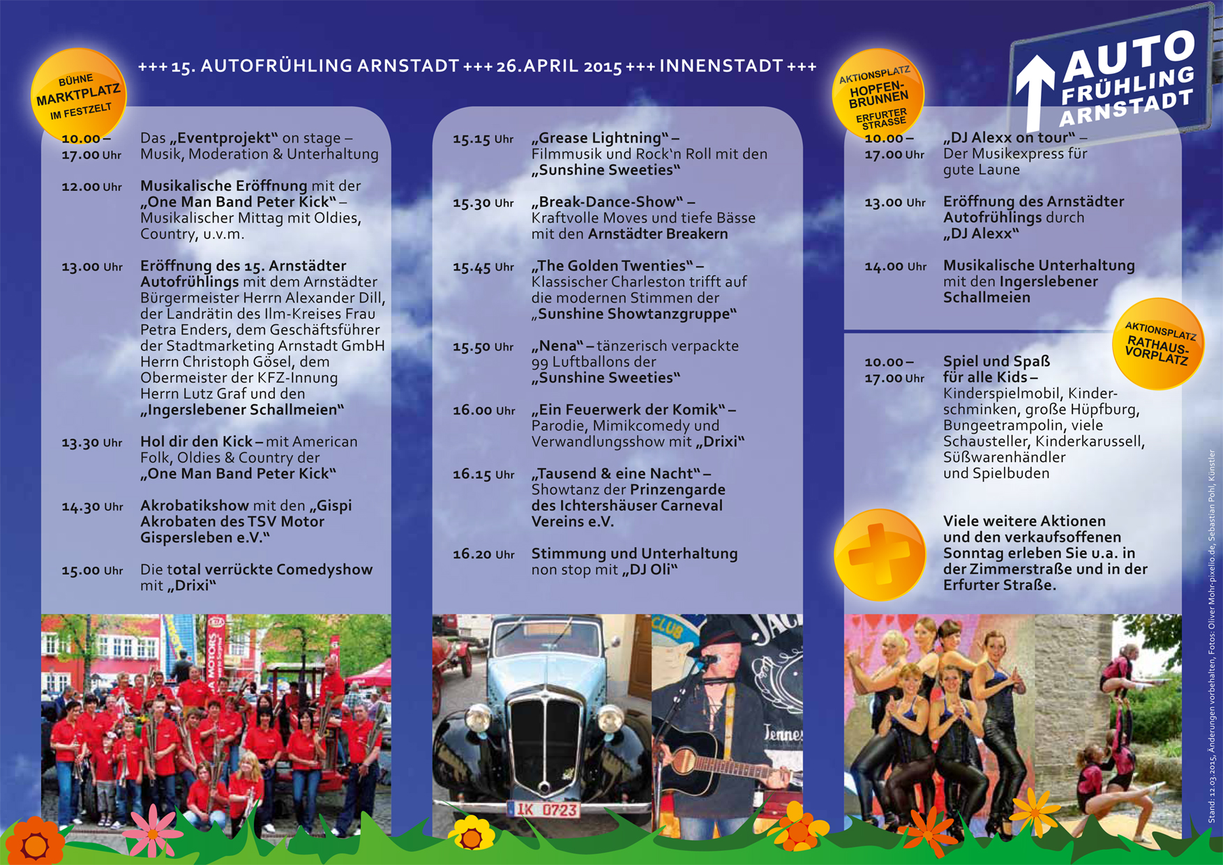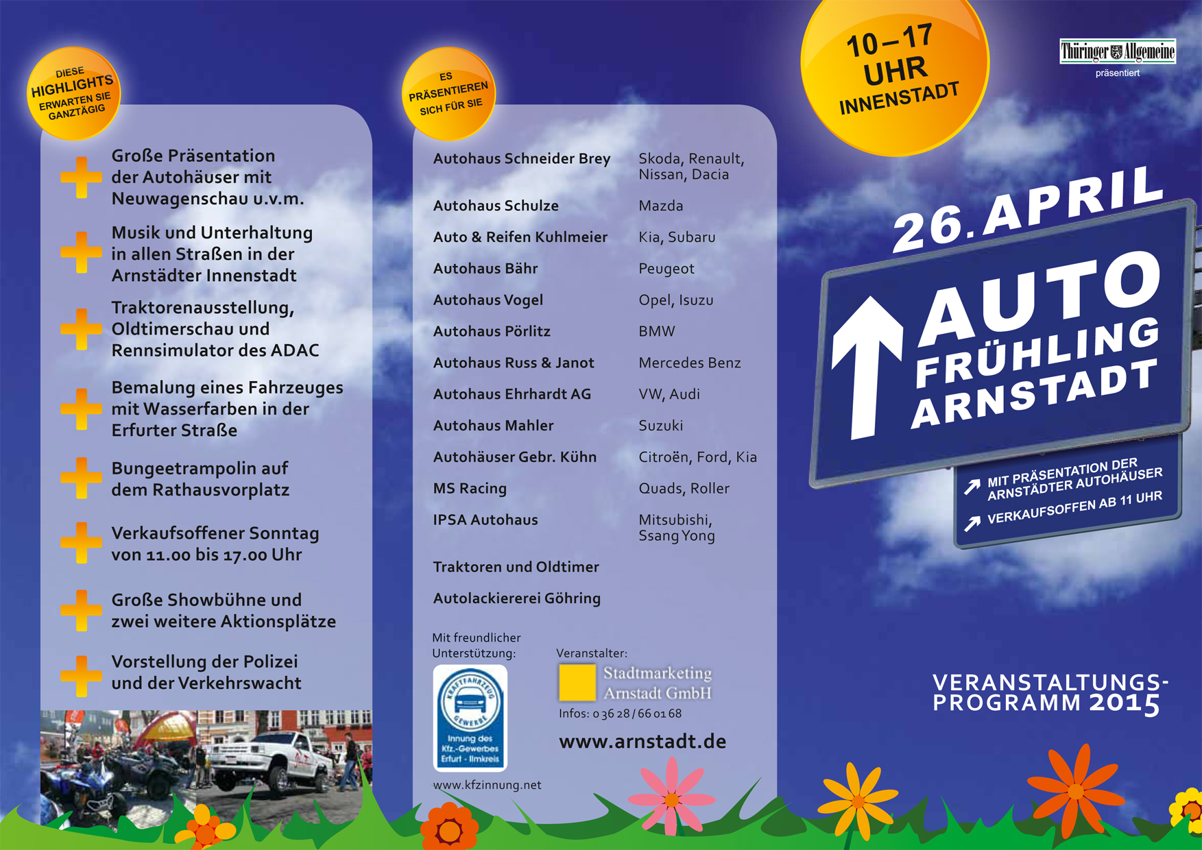 Organisiert durch die KFZ-Innung Erfurt/Ilm-Kreis und die Stadtmarketing Arnstadt GmbH, präsentieren sich zum 15. Arnstädter Autofrühling über ein Duzend lokale Autohändler, mit über 20 Fahrzeugmarken und über 100 Fahrzeugmodellen auf dem Markt, auf dem Holzmarkt, in der Erfurter Straße, und An der Neuen Kirche.